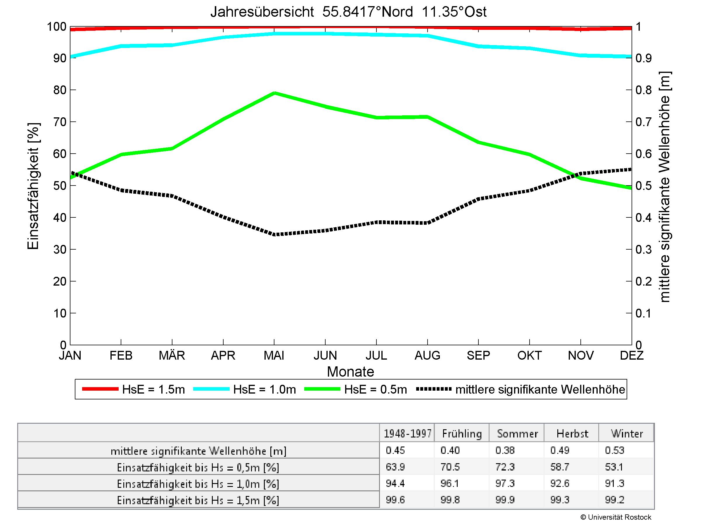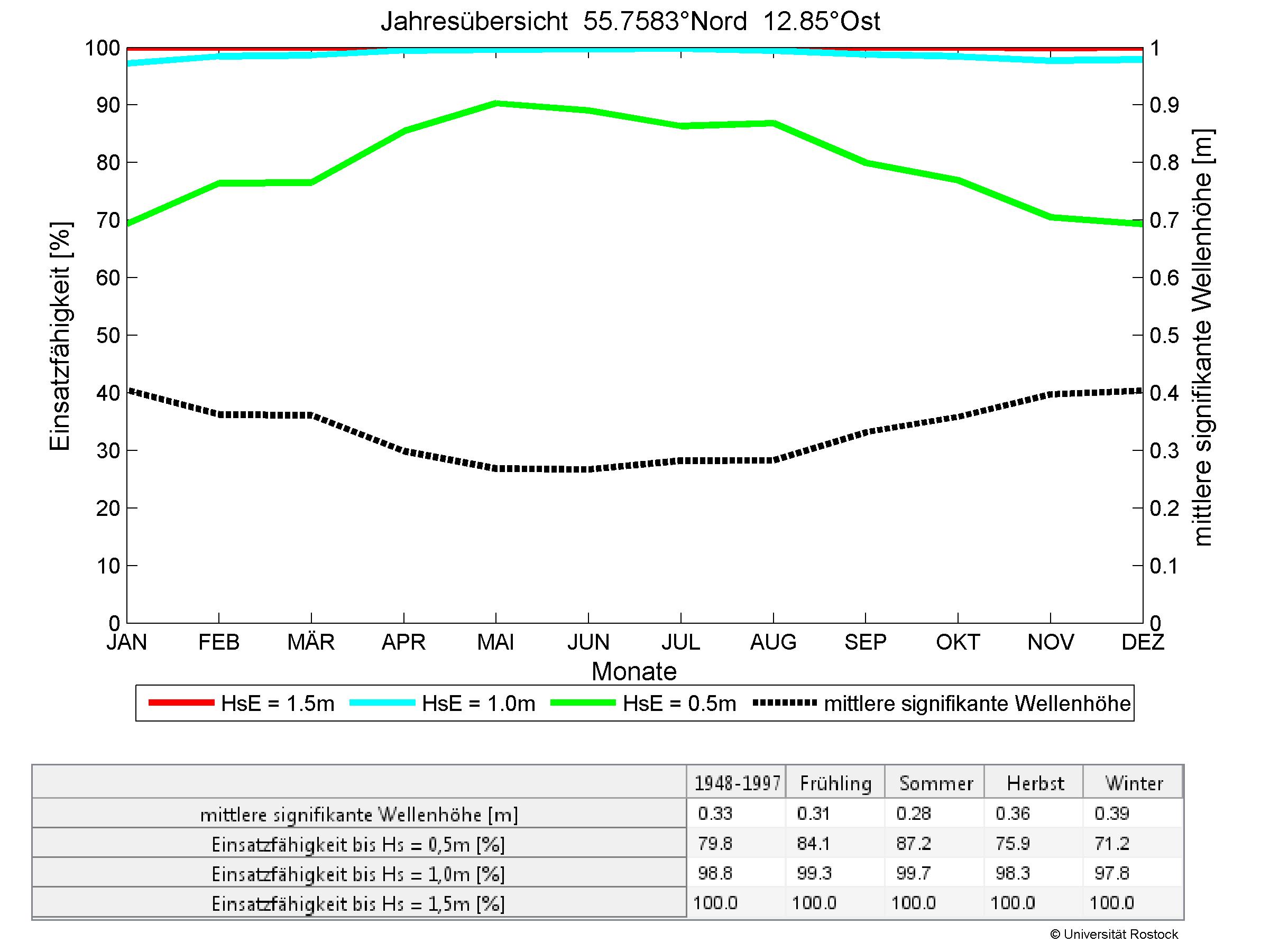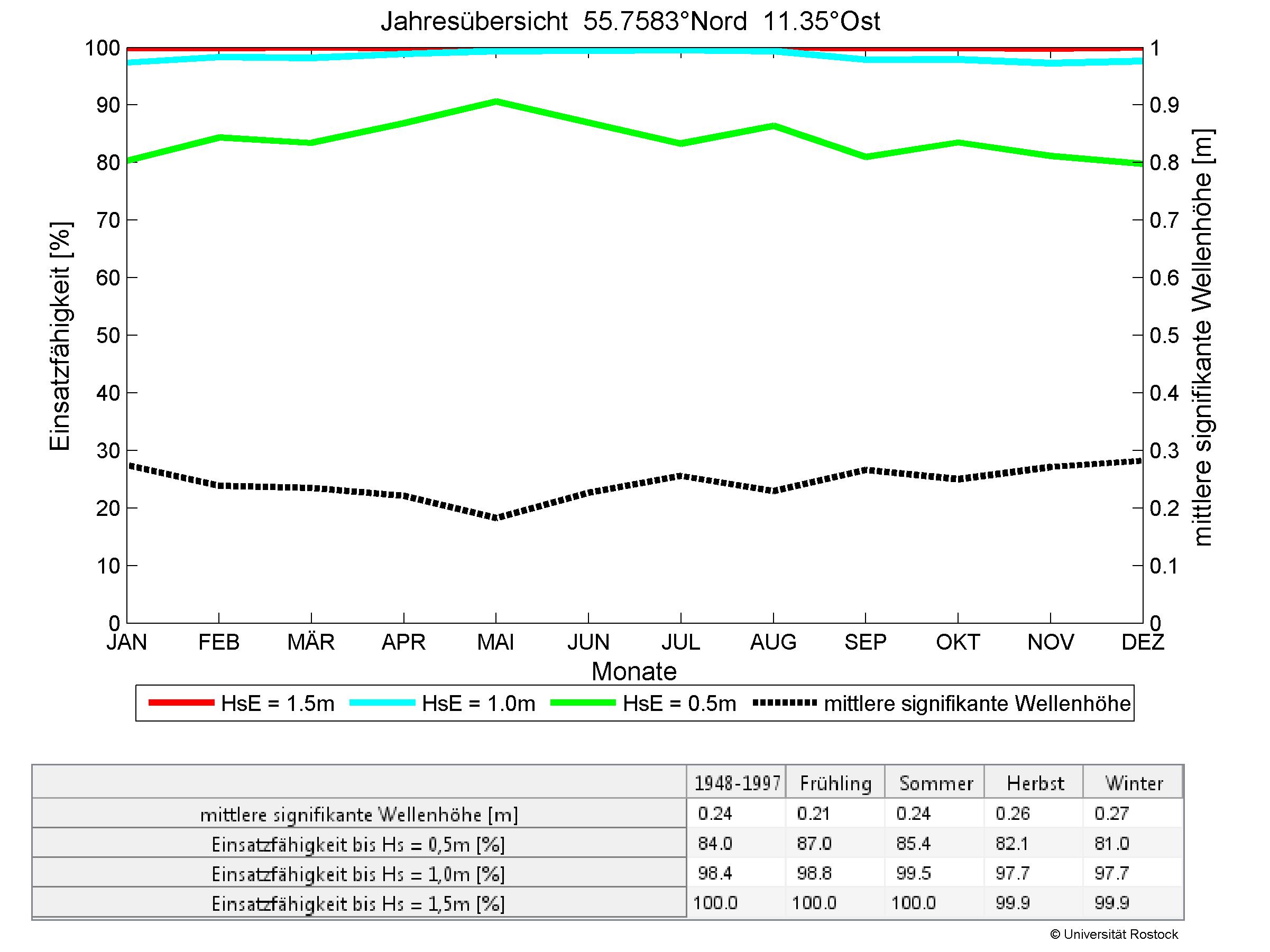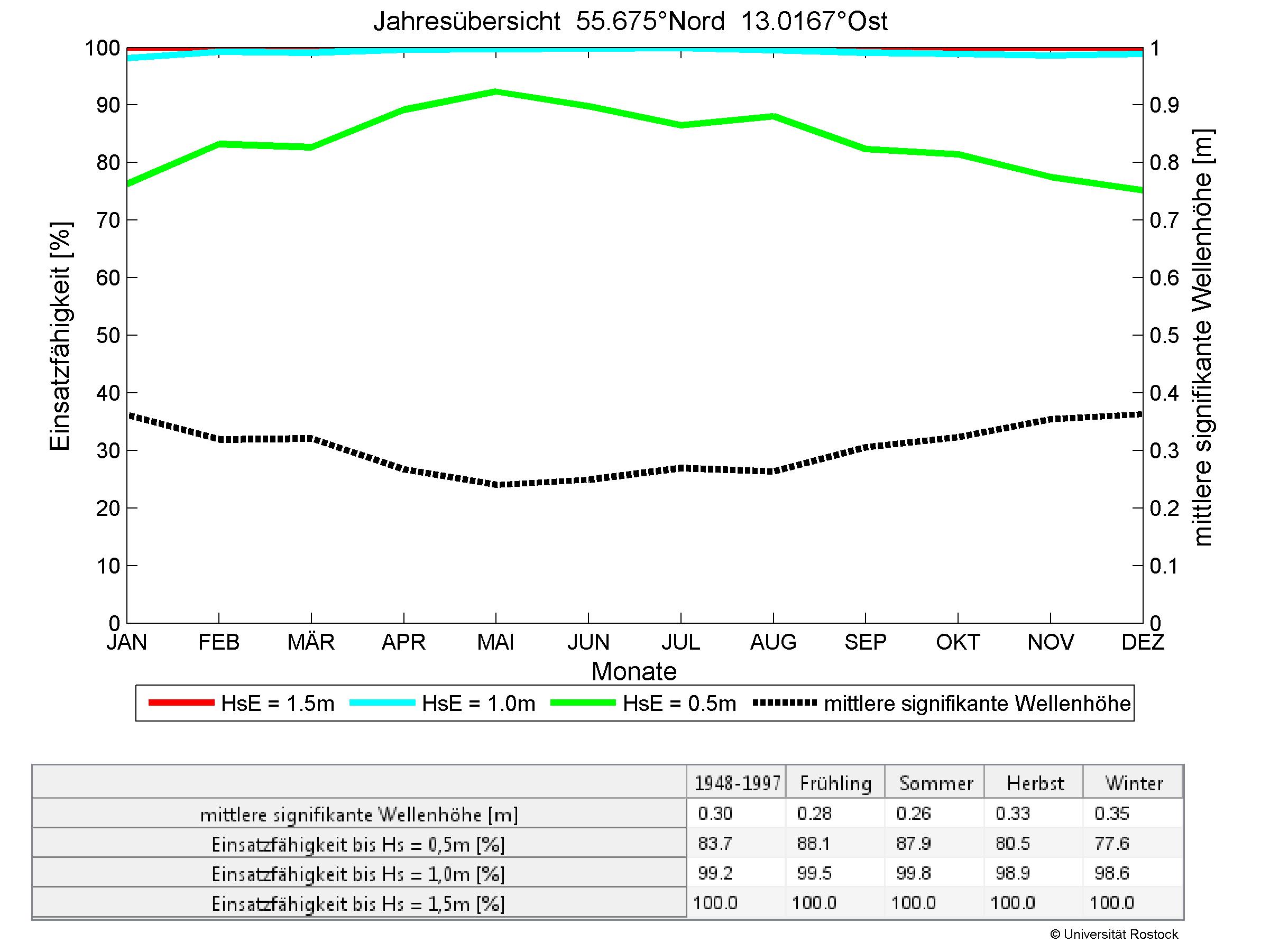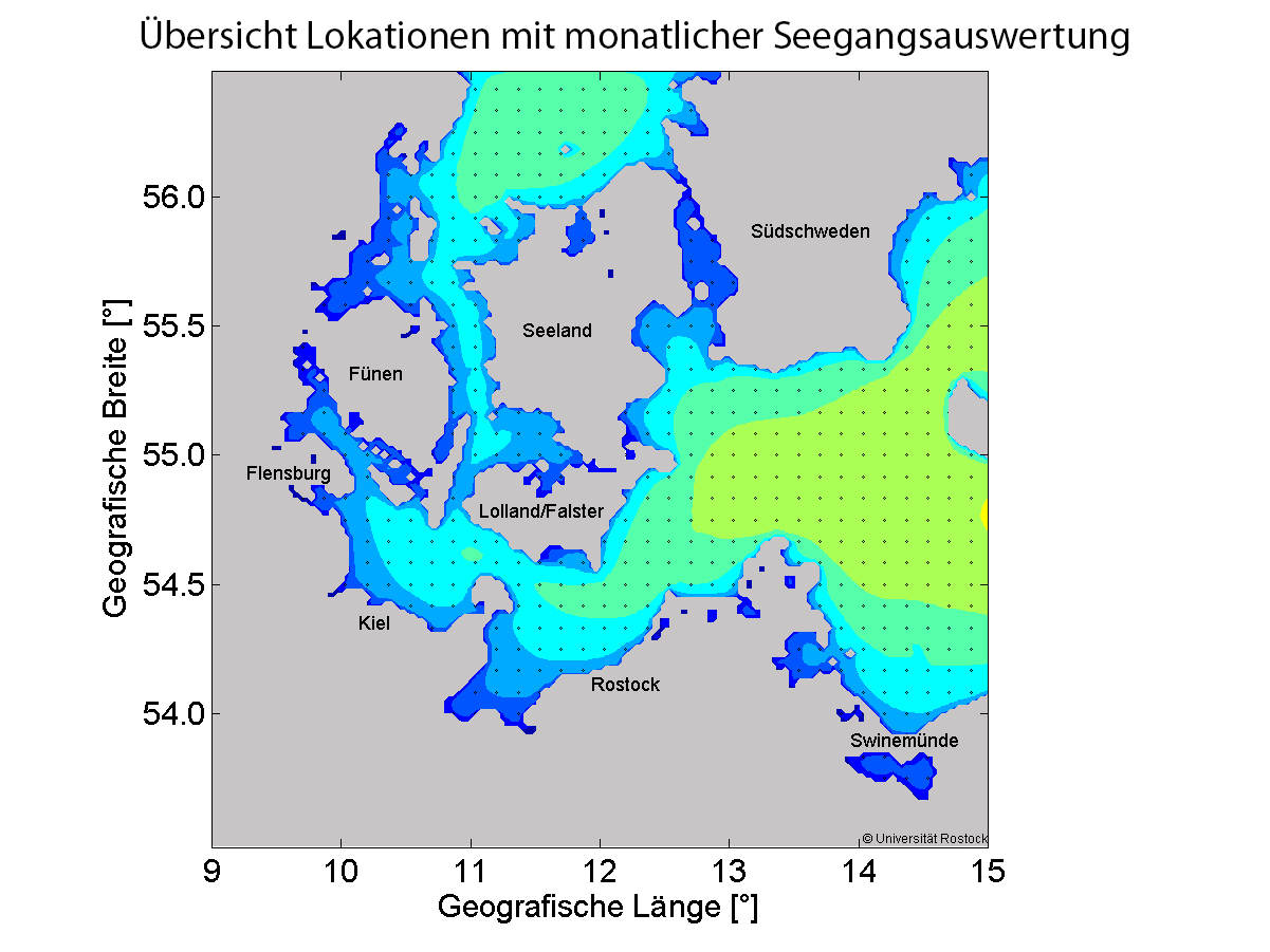 Im Forschungsprojekt MUSTOK (Jensen 2009) wurden unterschiedliche Modelle zur Ermittlung von extremen Wellenhöhen und Wasserständen an der Deutschen Ostseeküste ermittelt. Im Teilprojekt SEBOK B wurden auf Grundlage der zuvor beschriebenen Winddaten die stündliche signifikante Wellenhöhe für die Deutsche Ostsee ermittelt (Schlamkow & Fröhle 2009). Die Seegangssimulationen wurden mit dem Seegangsmodel SWAN erstellt (Booij et al. 2001). Für die Simulationen wurde eine Bathymetrie der Ostsee mit einer Auflösung Δx ≈ Δy ≈ 5,5 nm verwendet (Seifert et al. 2001). Zur Qualitätsprüfung wurden die Modeldaten mit vorhandenen Messdaten verglichen.